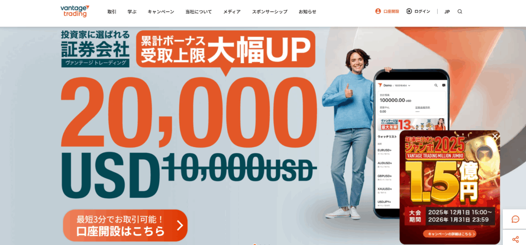 ![]() Vantage | 合計20,000ドル(約300万円まで) | 口座開設する【無料】 |