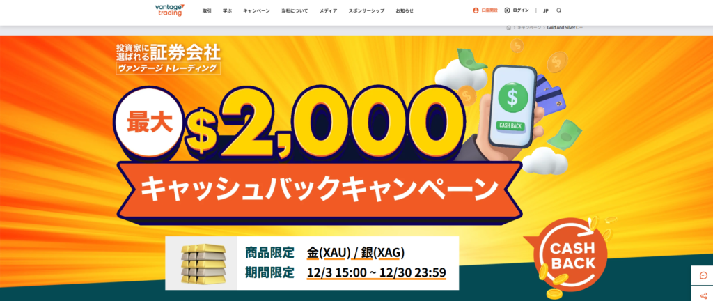 - 金(ゴールド)・銀の取引で最大2,000ドル(約30万円)キャッシュバック
