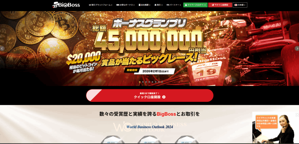 | 3位 BigBoss | 【キャンペーンが業界トップ】 口座開設ボーナス15,000円 入金ボーナス最大約210万円 4500万円相当の景品があたるキャンペーン開催中 日本語での完全サポート完備 \15,000円の口座開設ボーナス/ 口座開設する【無料】 |