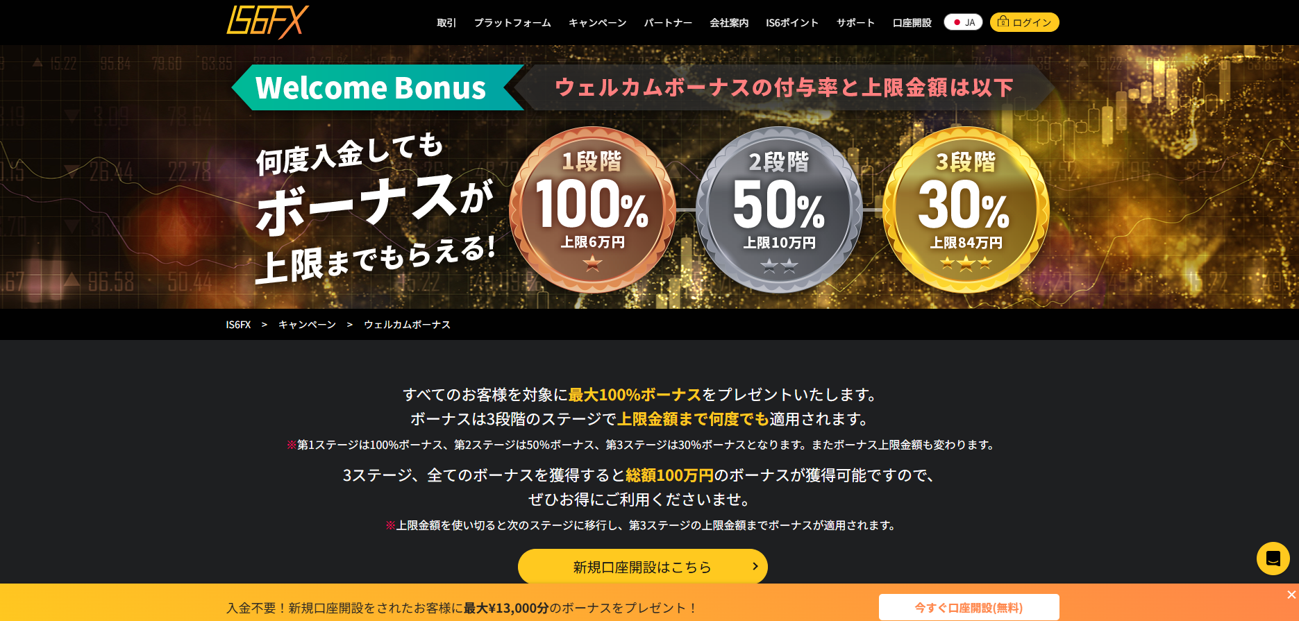 | その他 | ・ボーナス自体の出金はできません。 ・すでにIS6FXに口座をお持ちの方はこのキャンペーンの対象外です。 ・2万円以上の入金がない方は通常の13,000円の口座開設ボーナスのみとなります。 ・利益の出金額に上限はありません |